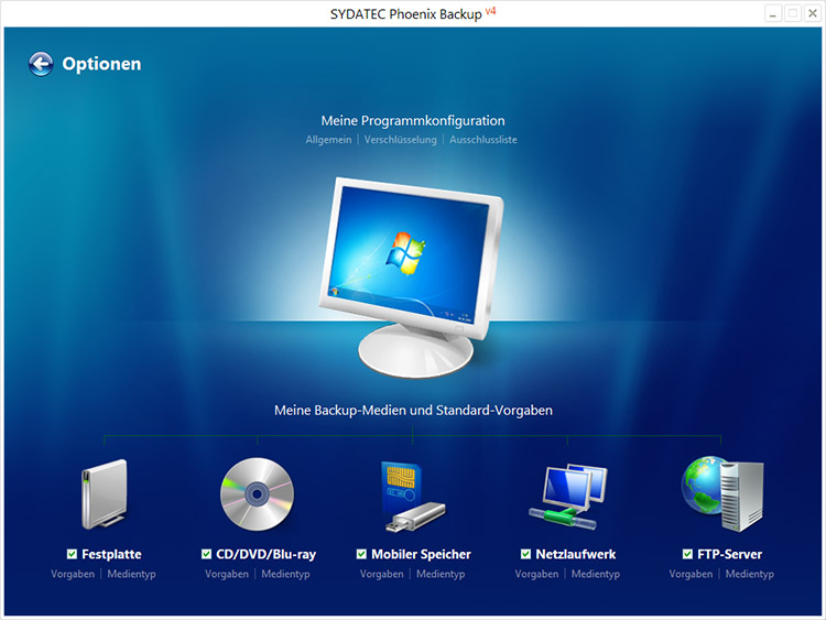 Damit Phoenix Backup die von Ihnen bevorzugten Sicherungsparameter und die verwendeten Backup-Medien kennt
