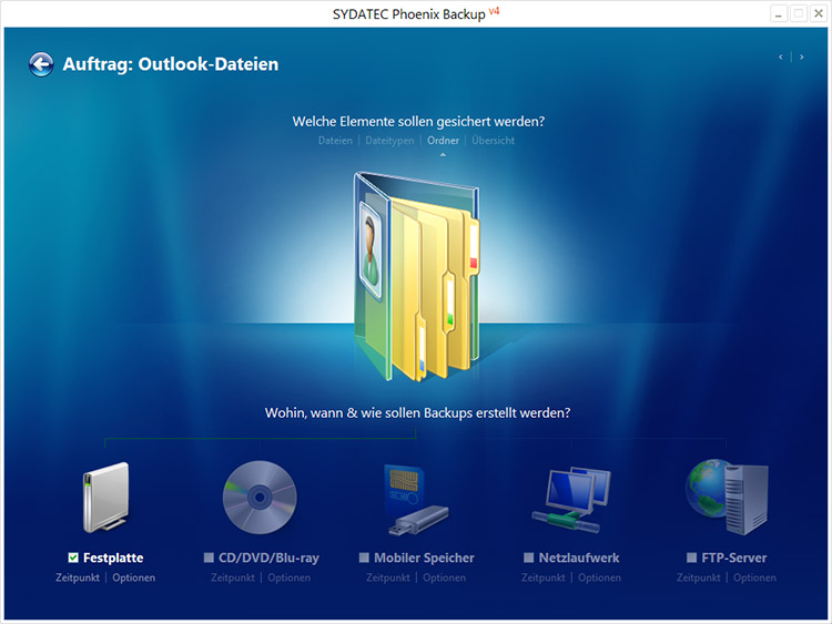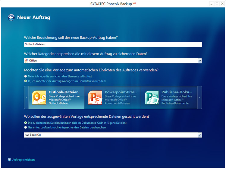 In diesem Beispiel werden wir einen Auftrag für die Sicherung der Microsoft Outlook-Dateien einrichten.